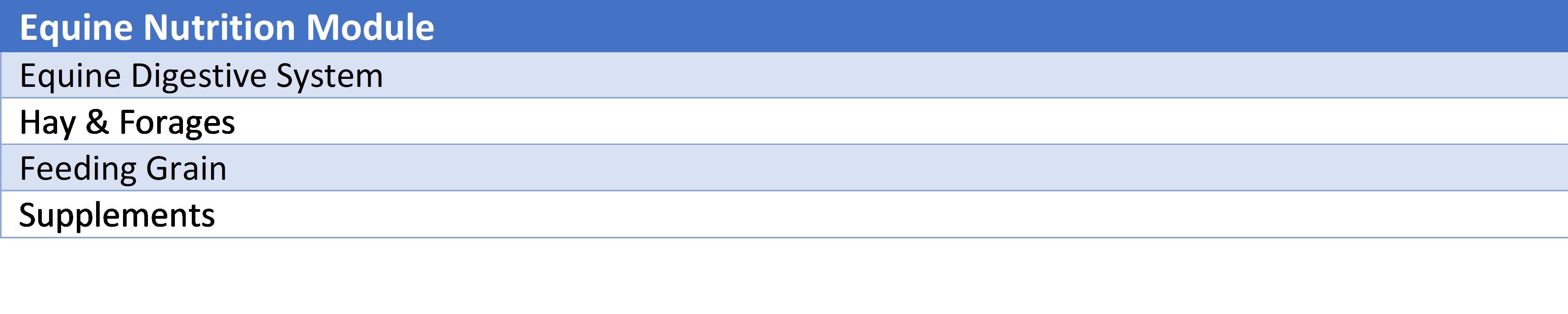 Equine Academy was developed by the North Florida Livestock Agents Group. This course contains 5 modules with in-depth information regarding pastures & forages, equine nutrition, health, safety, and horsemanship.